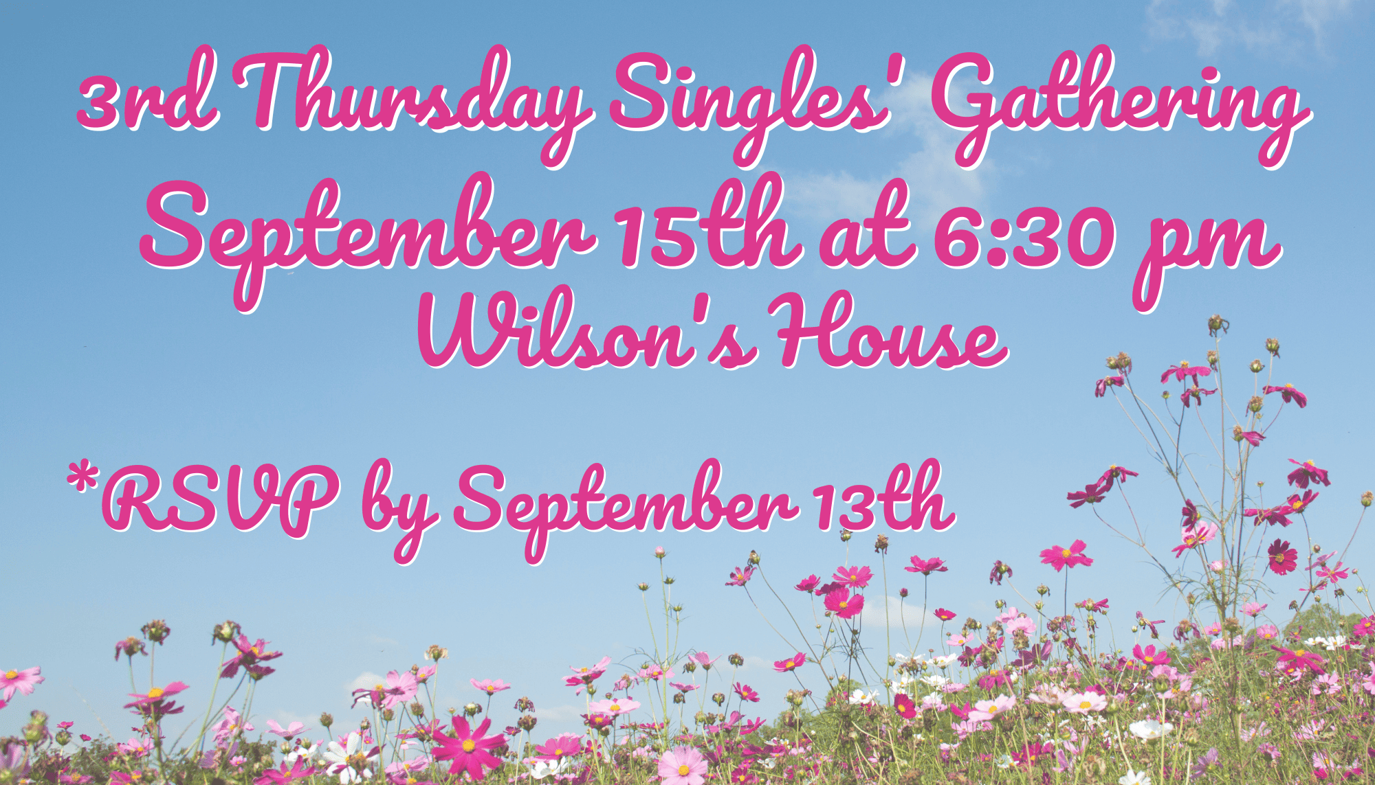 Come join us at our monthly 3rd Thursday Singles’ Gathering on September 15th at 6:30 pm for a great time of fellowship!