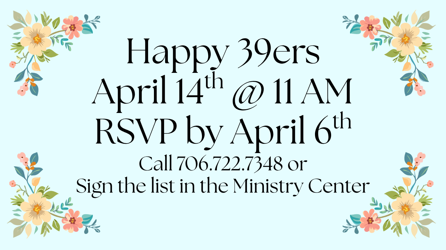 Our next Happy 39ers will be held on April 14th in B105. Please reserve your spot by either calling 706-722-7348 or signing the sheet in the Ministry Center. Deadline to RSVP is April 6th.