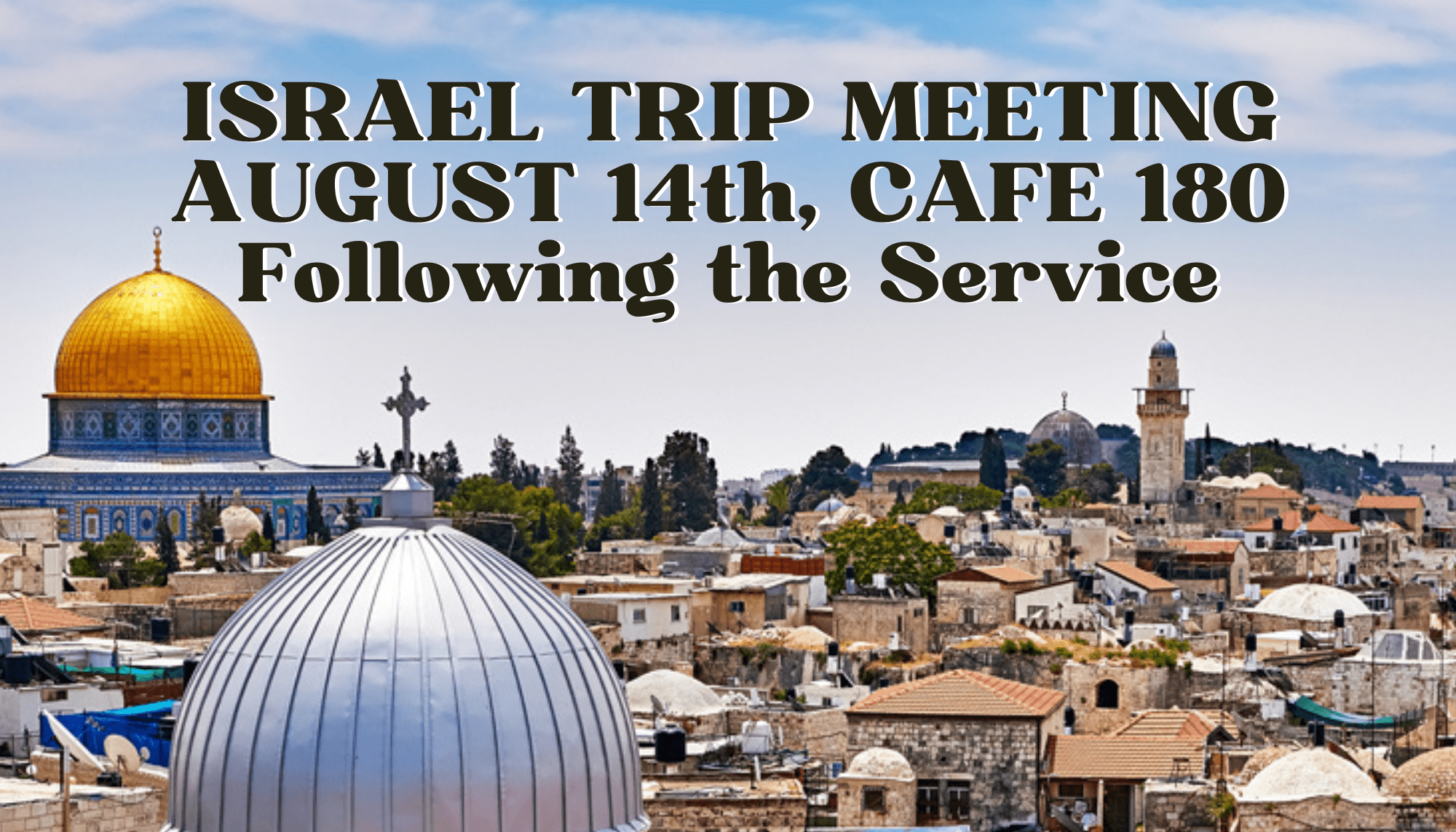 There will be an information meeting about the upcoming Israel trip following the service on August 14th in Café 180. We still have room for you! Click this link to sign up: ISRAEL TRIP (scroll down on the website until you find the one with Pastor Mark’s name – December 26, 2022 – January 4, 2023).