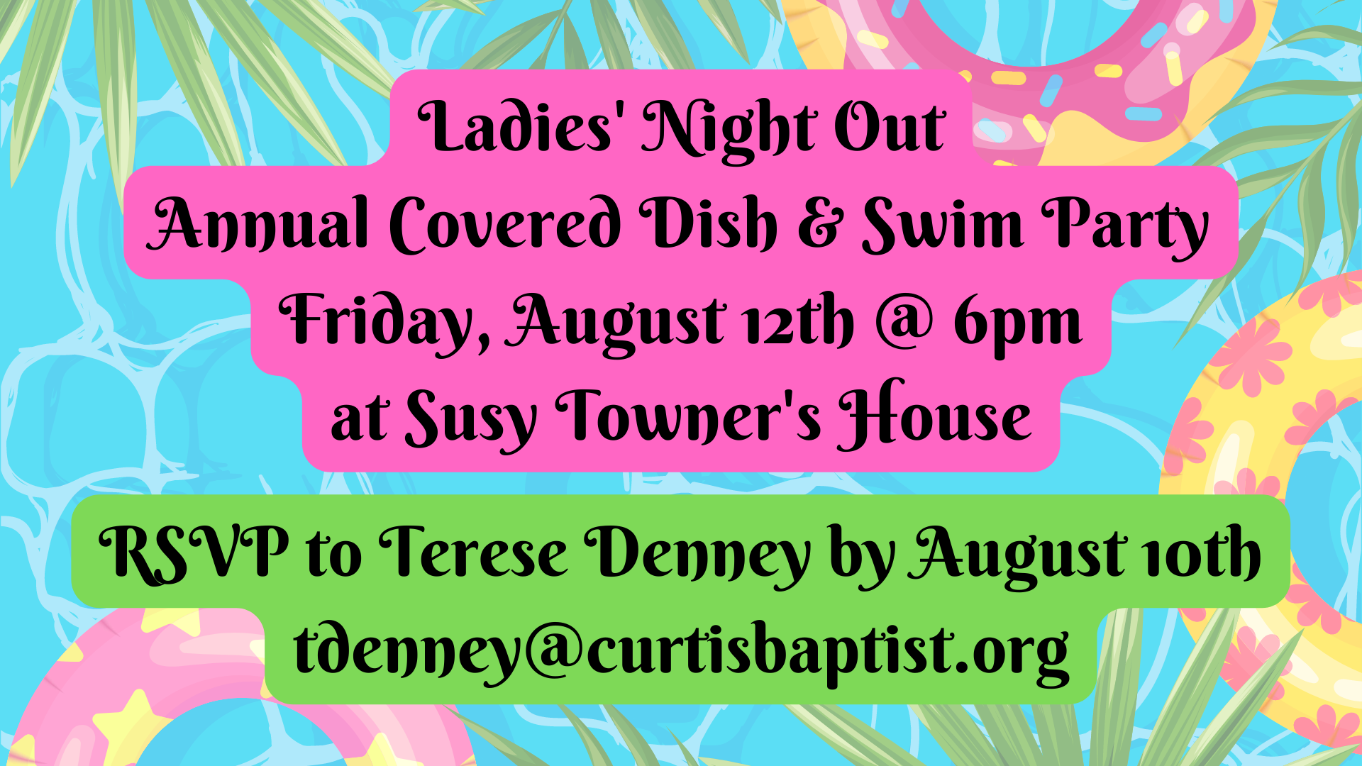 Ladies Night Out Annual Covered Dish and Swim Party, Friday, August 12 @ 6pm. Bring a covered dish, for a wonderful evening of fun and fellowship! Wife Saver chicken strips will be provided! Change of location this year to the home of Susy Towner. Please RSVP to Terese Denney tdenney@curtisbaptist.org by Wednesday, August 10, letting us know what dish you will be bringing!