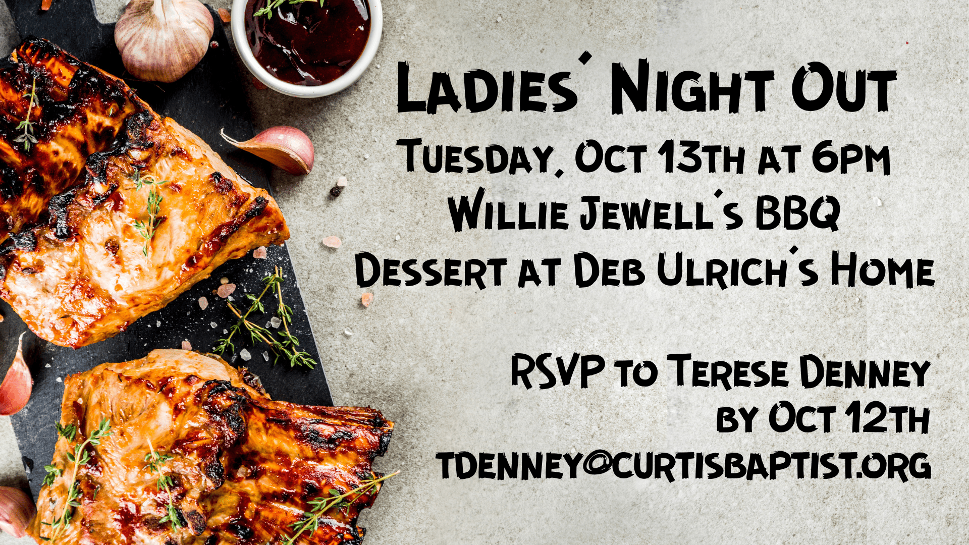 The next Ladies’ Night Out will be on October 13th at 6:00 pm. Meet us at Willie Jewell’s BBQ for dinner with Dessert to follow at Deb Ulrich’s home. Please RSVP to Terese Denney by October 12th @ tdenney@curtisbaptist.org.