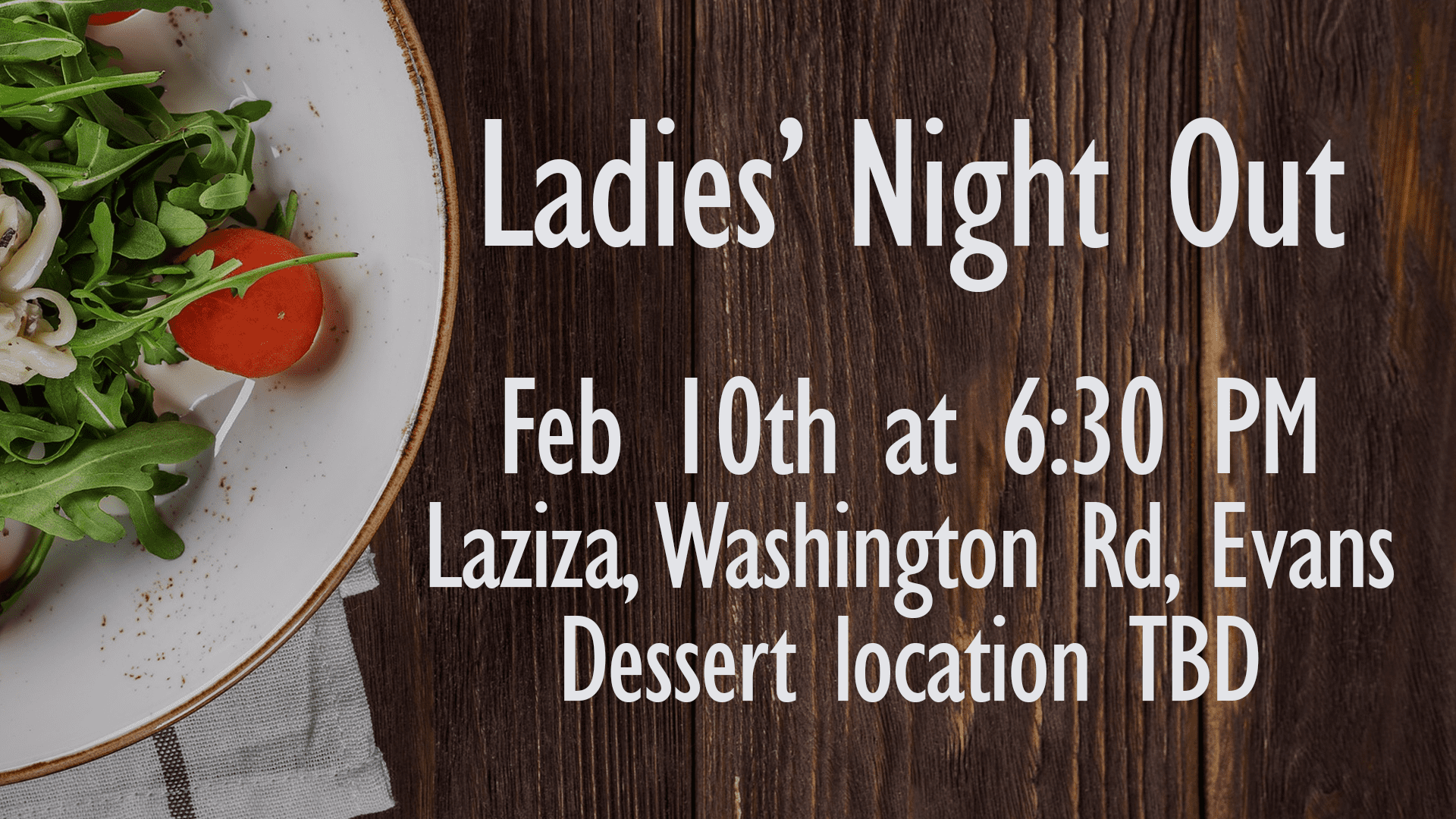 The next Ladies’ Night Out will be on February 10th at 6:30 pm. The ladies will meet at Laziza’s on Washington Road in Evans for dinner. It has not been determined at this time where the dessert will be following the dinner. Please RSVP to Terese by February 9th at tdenney@curtisbaptist.org.