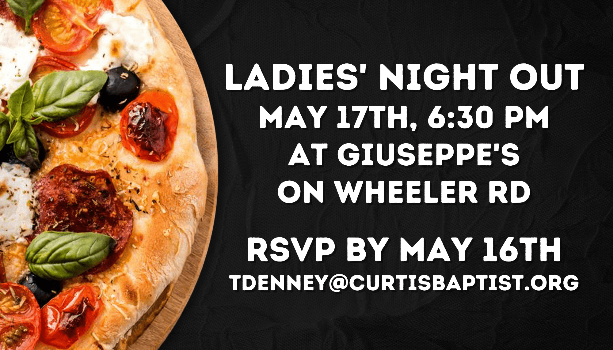 The next Ladies’ Night Out will be on May 17th at 6:30 pm at Giuseppe’s on Wheeler Road. Please RSVP to Terese Denney by May 16th at