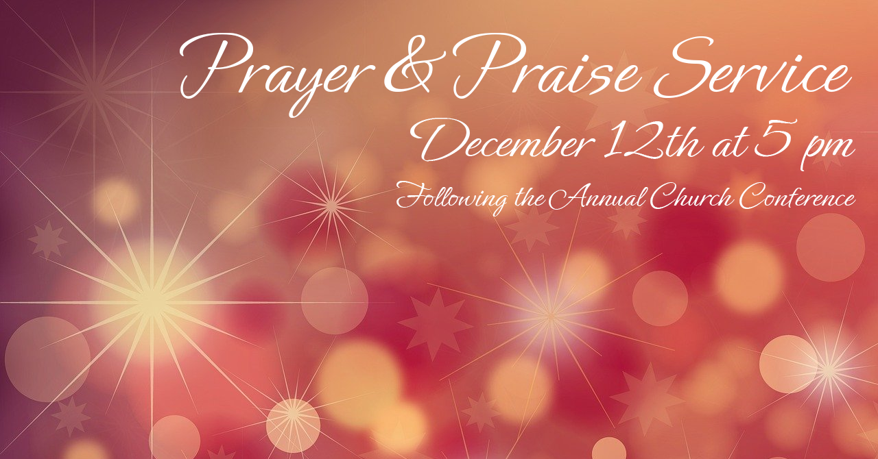 Make plans to join us for our monthly Prayer & Praise service on December 12th. The service will begin following our 5 pm Annual Church Conference.