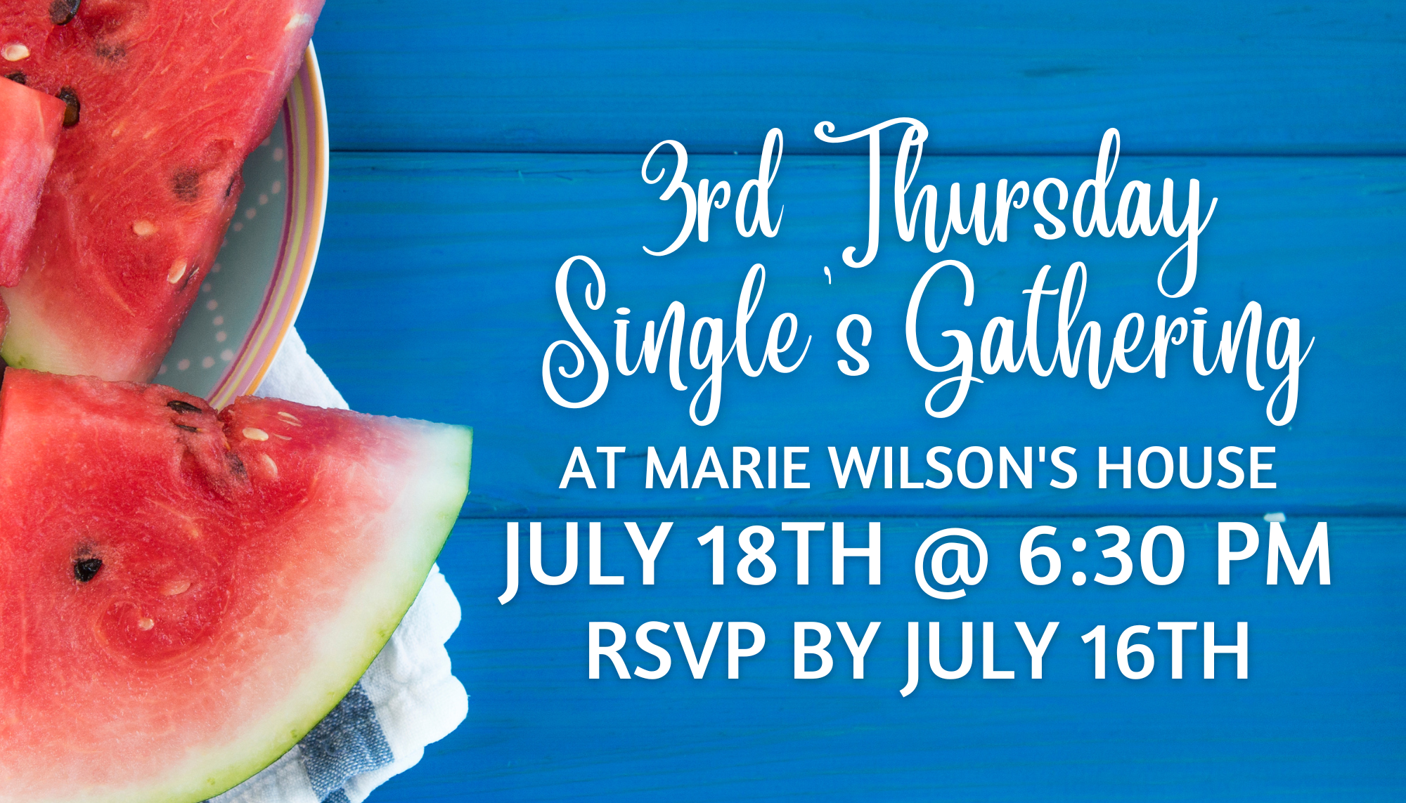 The next Single’s Gathering at Marie Wilson’s will be July 18th at 6:30 PM. Please let her know you are attending by texting her at (803) 640-2776 by July 16th.
