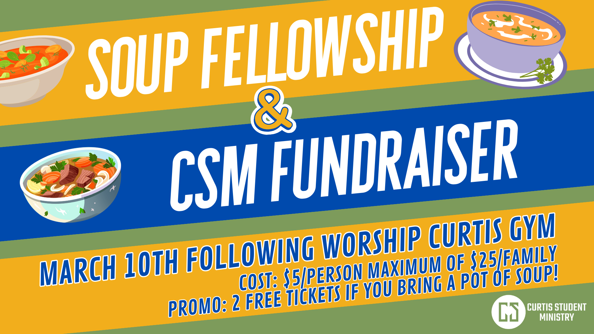 Get signed up for the March 10th Soup Fellowship & CSM Fundraiser! If you sign up to bring a soup, you get two FREE tickets! Click HERE for all the details about signing up!