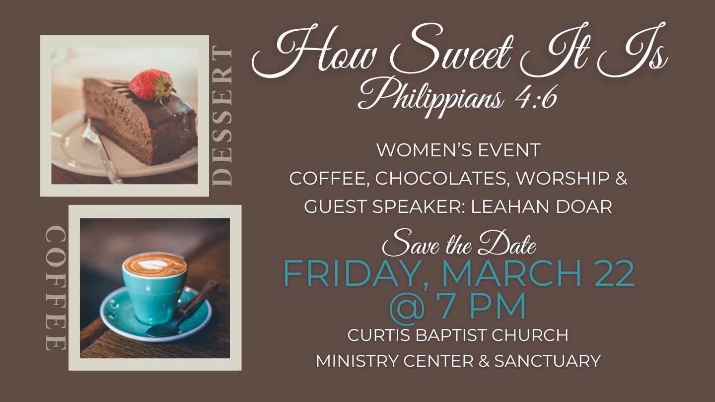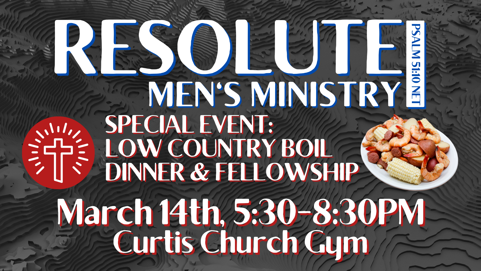The next Men's Event is March 14th at the Curtis Church Gym (not Cheeks). There will be a low country boil dinner, fellowship and testimony. Get signed up by clicking this link or on the sign up sheet in the Ministry Center. For more information, contact David Cole or Calvin Burgess.