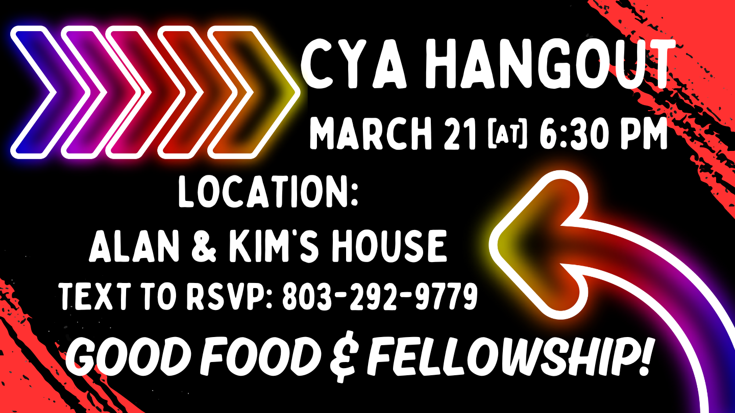 CYA (College & Young Adults - ages 18 to 20 something!) are invited to the next HANGOUT at Alan and Kim's house on March 21st at 6:30 PM. They will be sharing a meal, spending time in the Word, praying together and fellowshipping.
