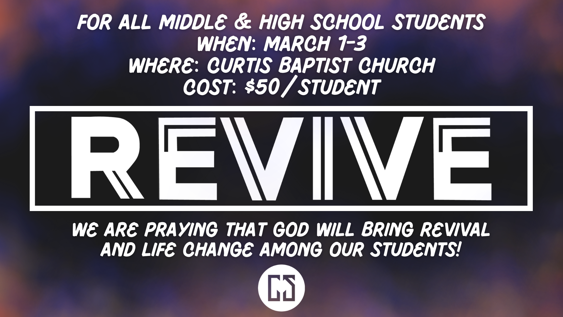 The Curtis Student Ministry (CSM) will host REVIVE Weekend here at Curtis March 1-3! Students - get signed up NOW by clicking Here because you do not want to miss REVIVE! The price is $50/student. We are praying for God to bring revival within the hearts and lives of our students. Please join us in praying for […]