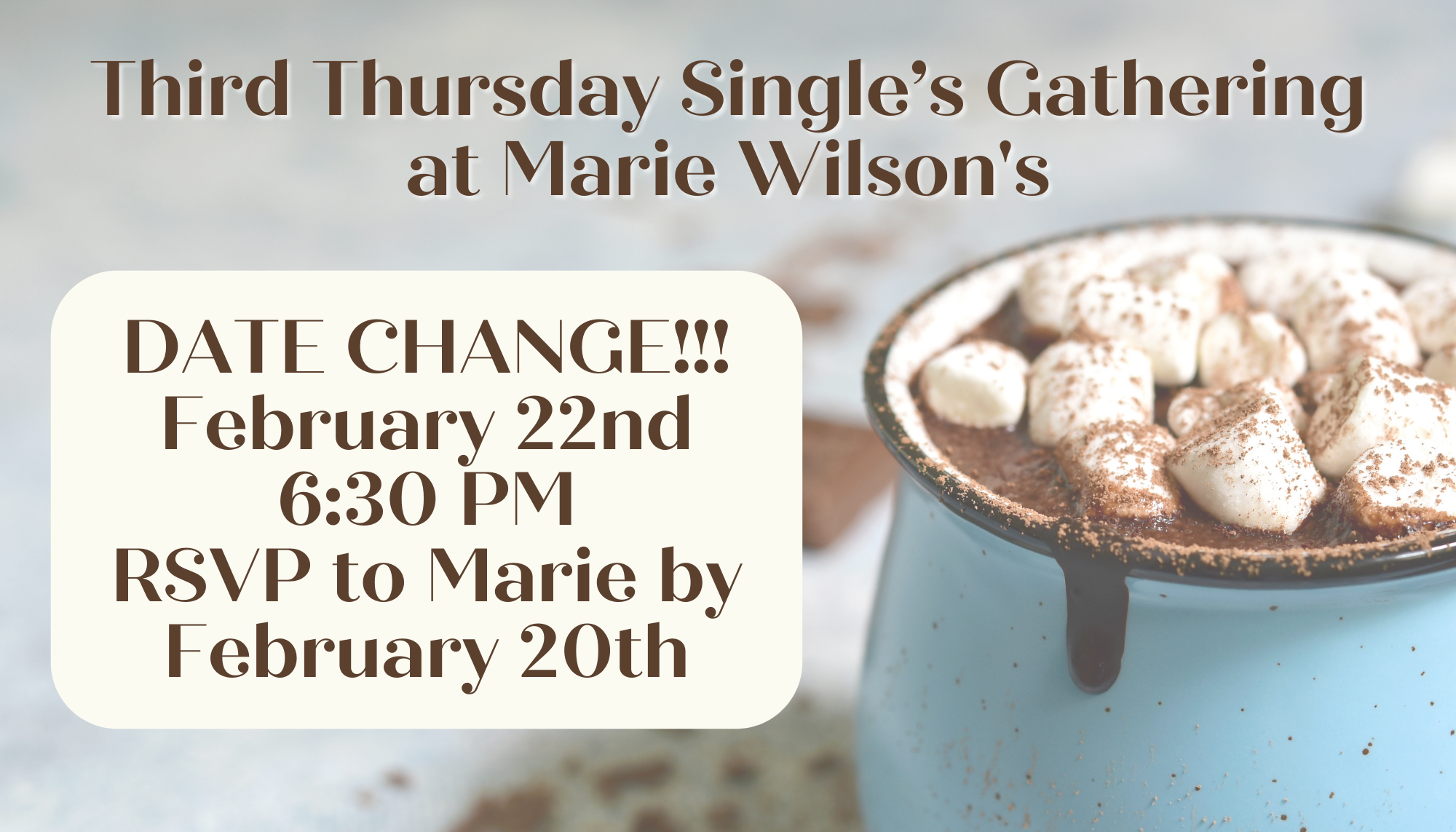 The monthly Third Thursday Single's Gathering at Marie Wilson's has changed this month to February 22nd. Please be sure to make that change on your calendar and also let Marie know if you are coming by February 20th.