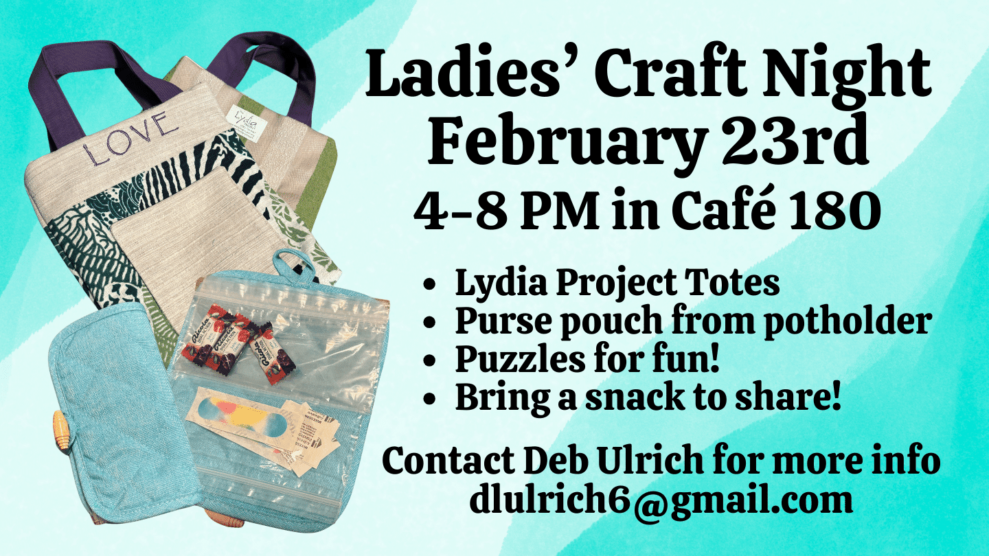 The Women's Ministry will have the next Craft Night on Friday, February 23rd in Café 180. There will be three fun options available from 4-8 PM! Come for part or the entire time! Here's what they will have going: - make a Purse Pouch to keep your purse organized - $5 covers supplies or bring your […]