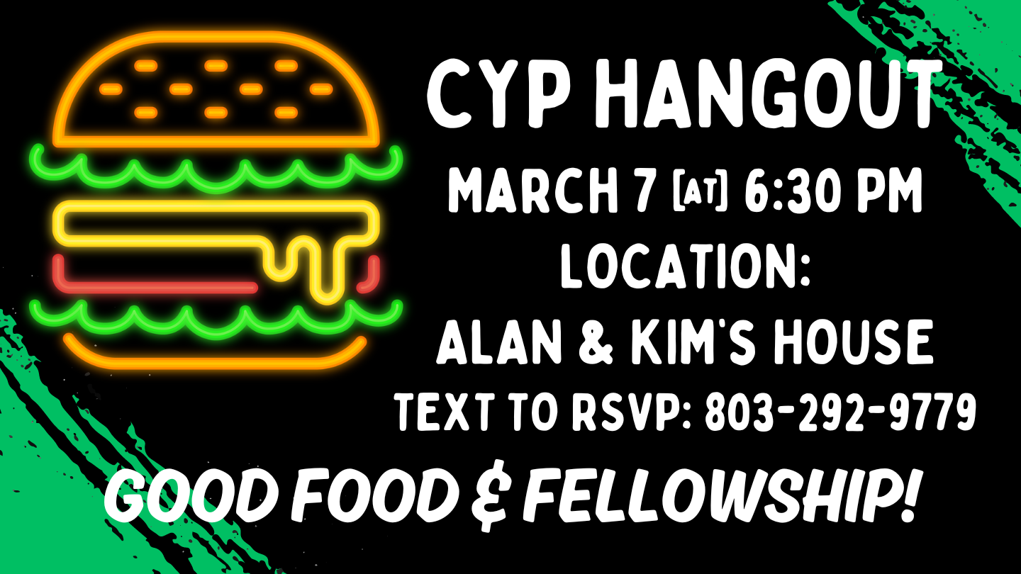 Inviting all College & Young Pros for a time to hangout at Alan & Kim Jones's house.  Let's get to know them as they have come on board to serve with the CYP Ministry.