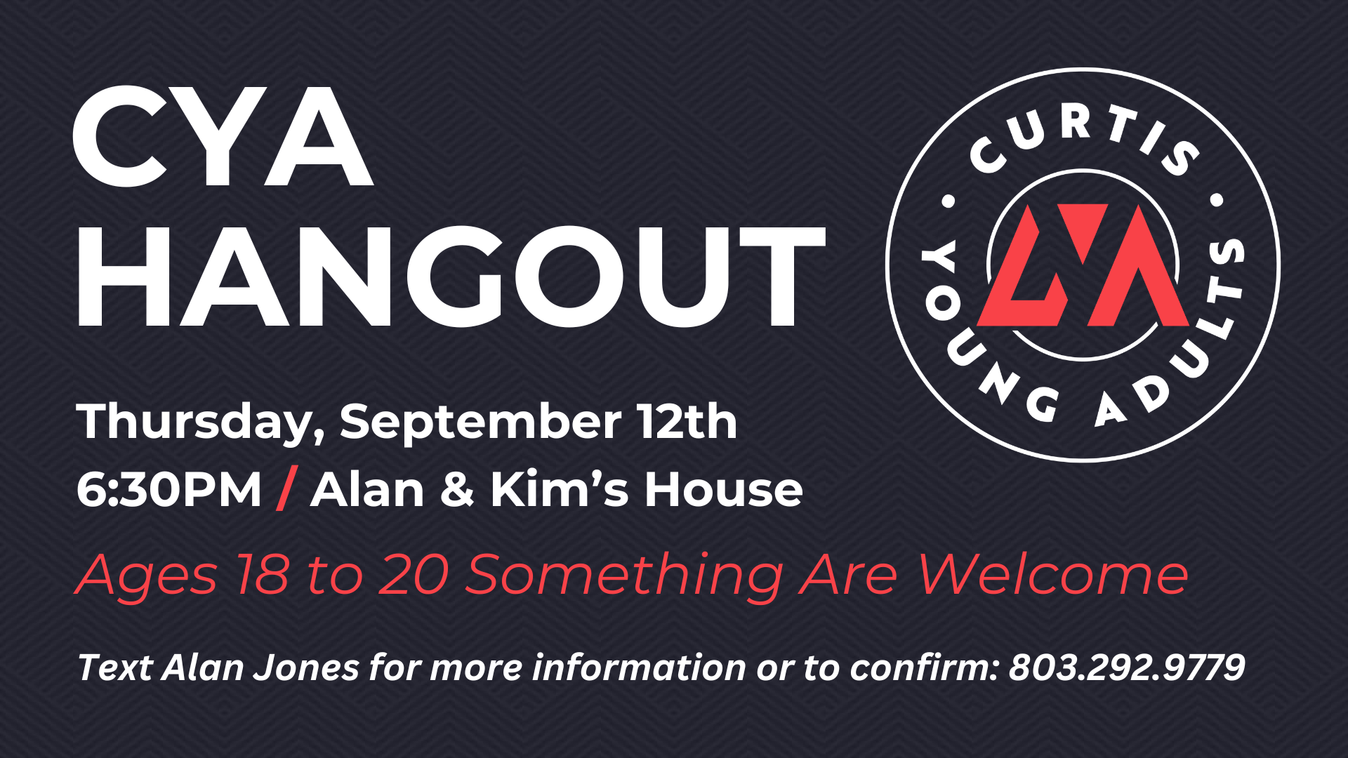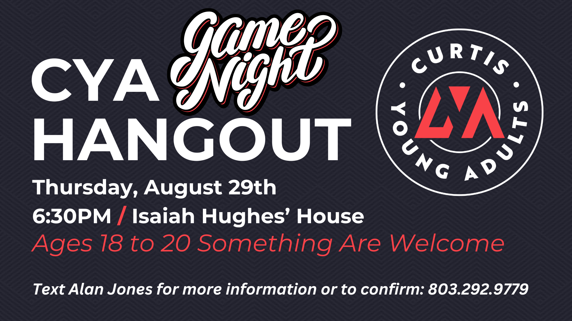 The next CYA Hangout is tonight at Isaiah Hughes' house starting at 6:30 PM. It will be GAME & TRIVIA NIGHT. Bring your favorite snack or finger food and make plans to come! Let Alan know you are coming by texting him at 803-292-9779.