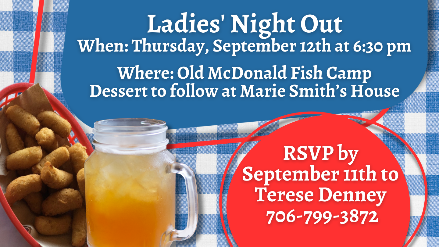 Terese Denney has planned the next Ladies' Night Out on September 12th at Old McDonald Fish Camp with dessert to follow at Marie Smith's house. They will meet at the Fish Camp at 6:30 PM. Let Terese know you are coming by texting her at 706-799-3872 before September 11th.