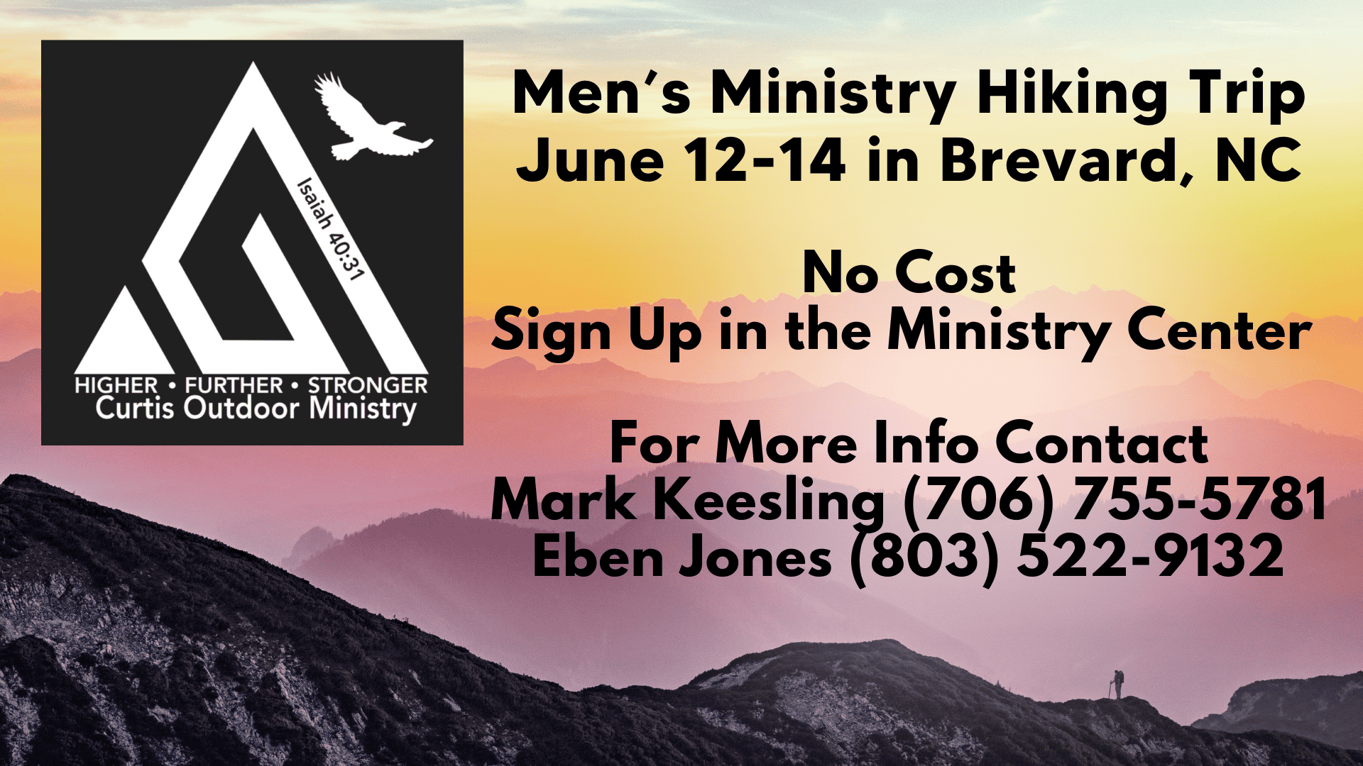 Curtis Men’s Outdoor Ministry Hiking Trip Jun 12 Curtis Men’s Outdoor Ministry Hiking Trip June 12, 2025 @ 8:00 AM - June 14, 2025 @ 5:00 PM