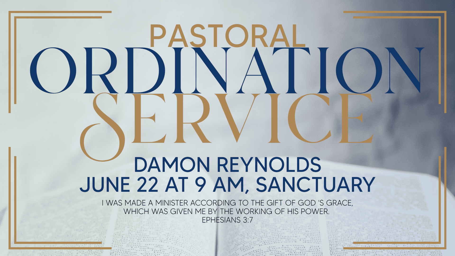 Pastoral Ordination Service for Damon Reynolds Jun 22 Pastoral Ordination Service for Damon Reynolds 9:00 AM - 10:00 AM